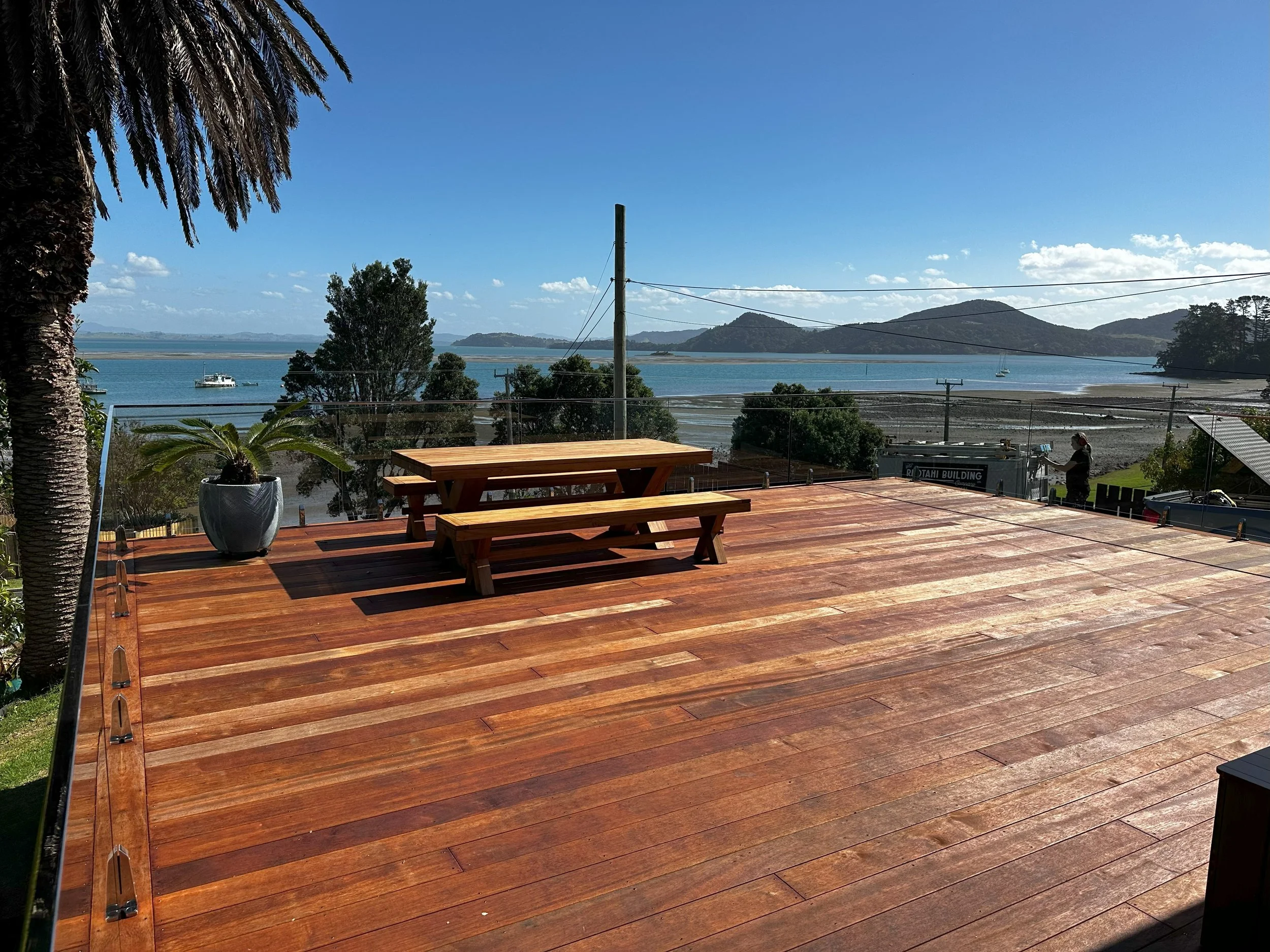 A wooden deck overlooking a body of water with hills in the background, a potted plant, and a picnic table at the center.