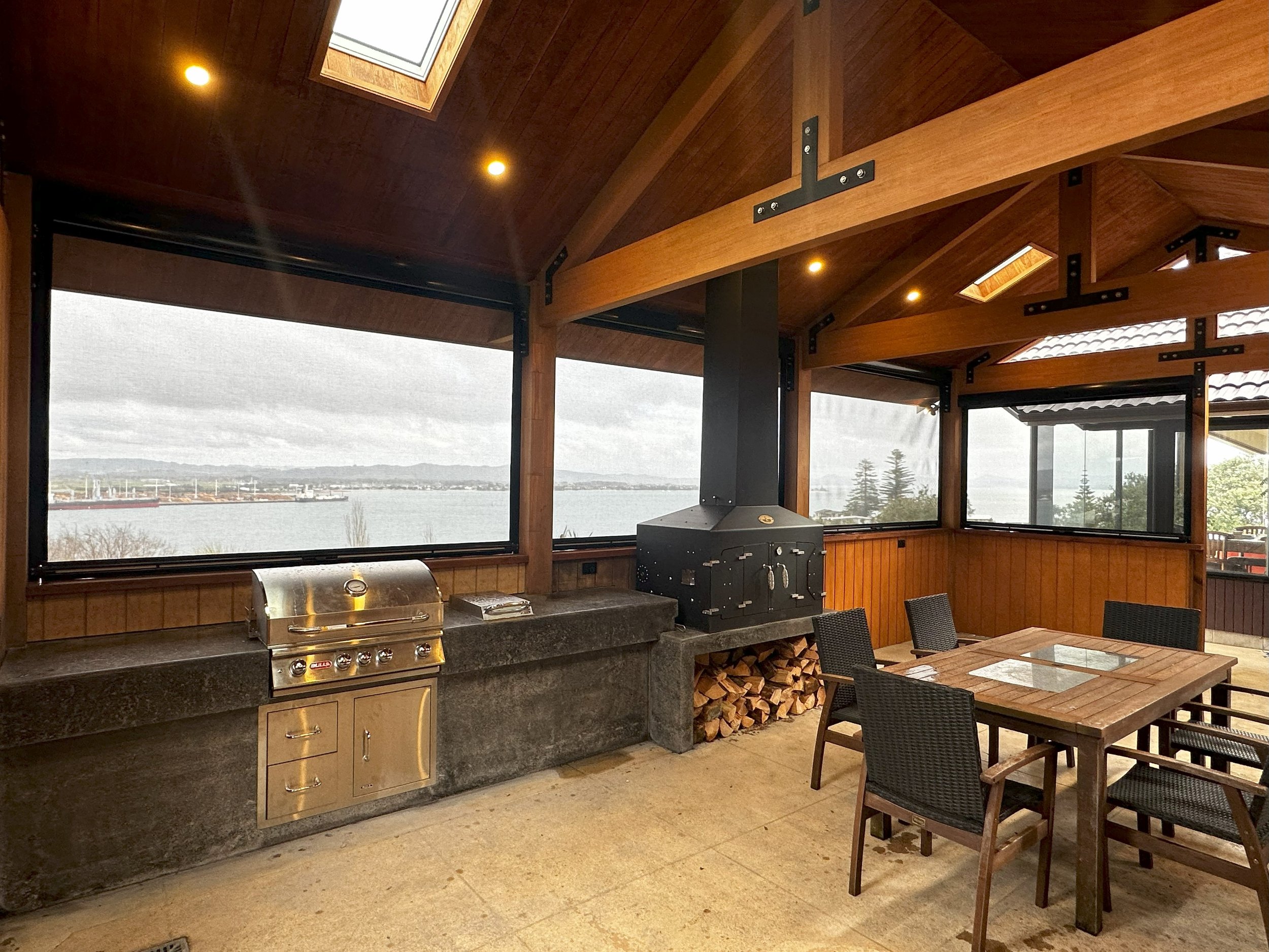 Indoor outdoor covered patio with large windows showing water and cityscape, wood ceiling and beams, outdoor fireplace with firewood, gas grill, and dining table with four chairs.