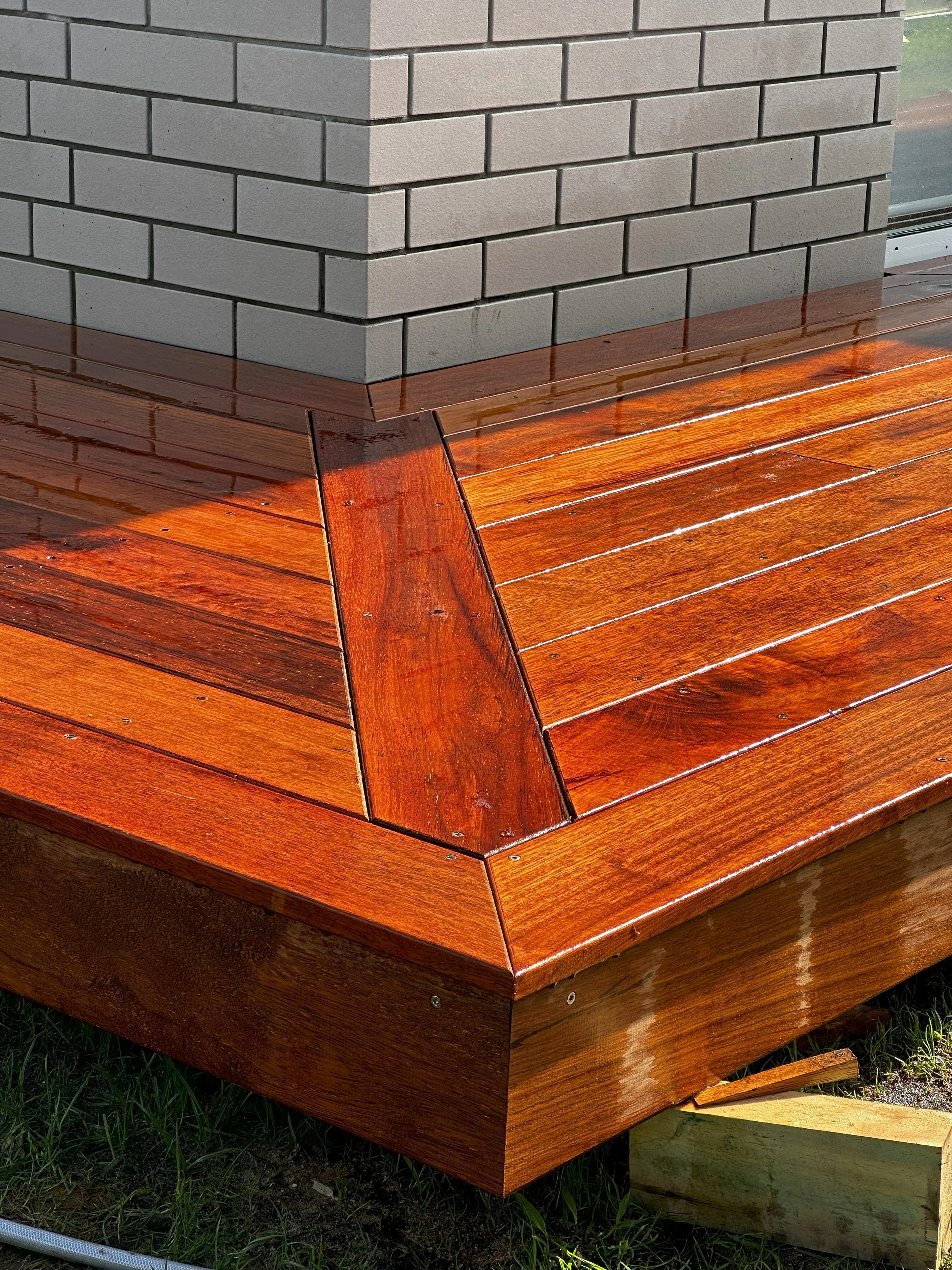 Close-up of a wooden deck with a corner meeting a brick wall.
